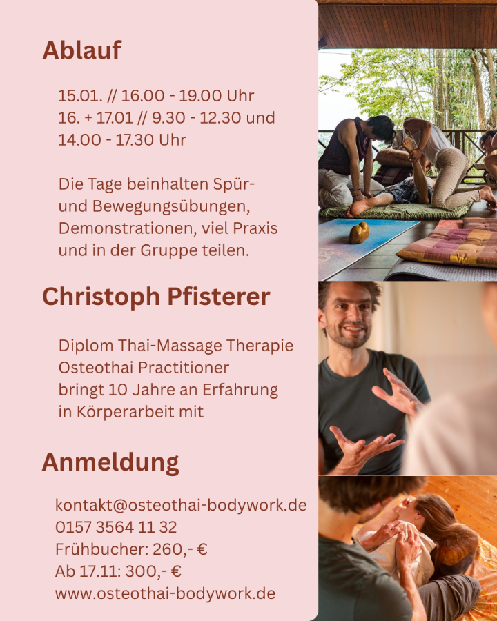 In diesem Workshop entdecken Teilnehmende erste Prinzipien und Techniken der Thai-Massage. Mühelos, effektiv und aus der eigenen Entspannung und Körpermitte heraus, geben und empfangen Teilnehmende eine kleine Massage-Sequenz.