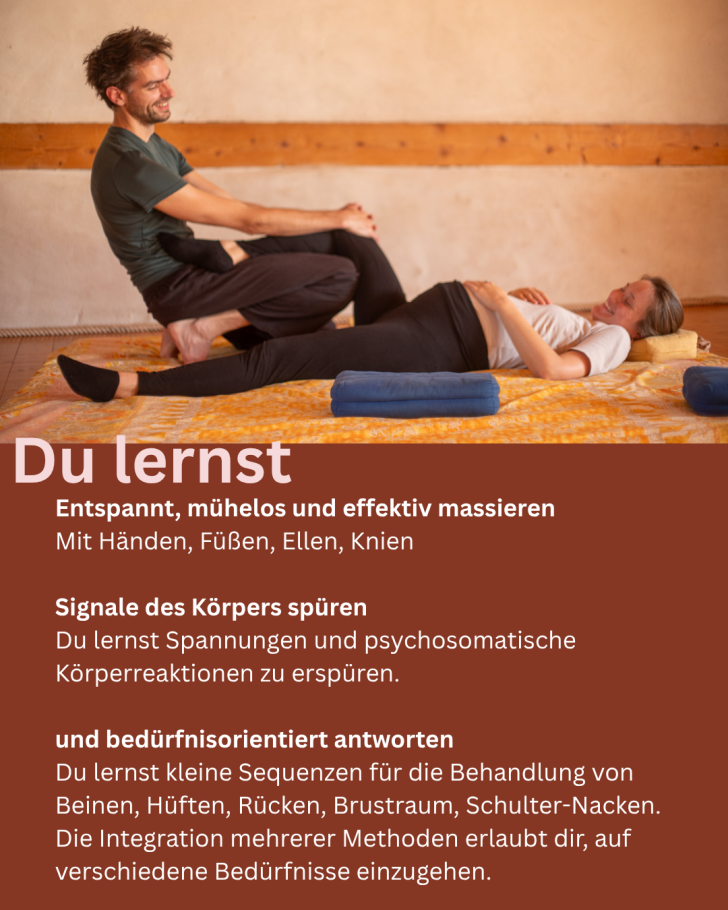 Mit Händen, Füßen, Ellen und Knien lernst du zu massieren -kleine Sequenzen für Beine, Hüfte, Rücken, Brustraum und Schulter-Nacken. Langsame, sanfte Akkupressur, rhythmische Bewegungen und Momente des Lauschens von Herzen bieten ein breites Spektrum an Methoden, um bedürfnisorientiert in Kontakt mit sich selbst und der empfangenden Person zu gehen.